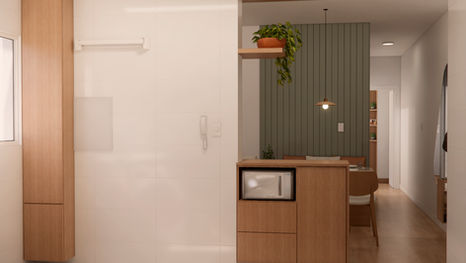 Utilizamos a marcenaria de forma extensiva para personalizar e otimizar cada detalhe, garantindo que cada canto fosse pensado com cuidado e consideração. Integramos a sacada à sala, trazendo mais espaço e luz para o ambiente, ao mesmo tempo que criamos um cantinho especial para momentos de descontração, atendendo a um pedido especial do casal de ter uma cervejeira.