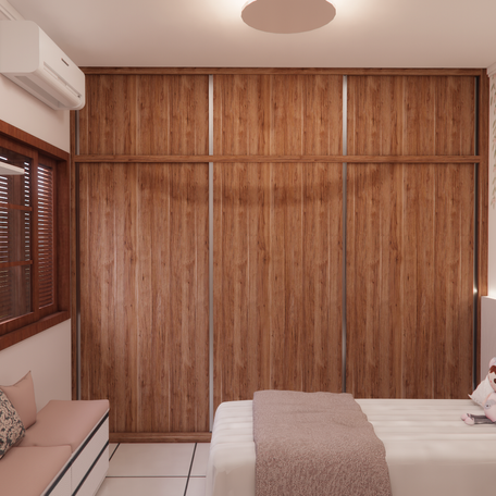Utilizando a marcenaria existente, conseguimos criar um novo armário, mudando completamente o layout do quarto. Aproveitamos o material do guarda-roupa antigo e reinventamos o espaço, trazendo mais fluidez e aproveitamento.